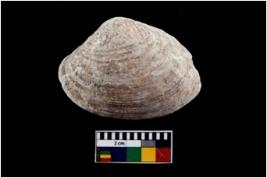 | Description / विवरण | Specimen of a large bivalve marine shell with ground edge. |