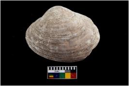 | Description / विवरण | Specimen of a large bivalve marine shell with ground edge. Probably use as spoon. |