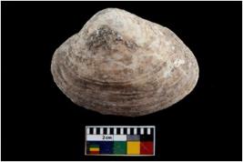 | Description / विवरण | Specimen of a large bivalve marine shell with ground edge. Probably use as spoon. |