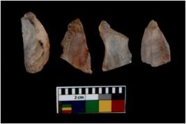 | Description / विवरण | There are n 4 utilized flake cores. There are multi directional irregular scar pattern on them. All of them are tapering at one end. |