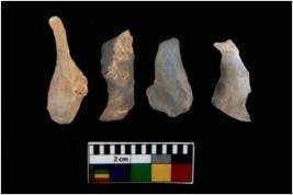 | Description / विवरण | There are n 4 utilized flake cores. There are multi directional irregular scar pattern on them. All of them are tapering at one end. |