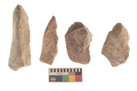| Description / विवरण | There are n 4 utilized flakes. There are multi directional irregular scar pattern on both dorsal and ventral face of the flakes. two are tapering at one end and two have sharp edges. |