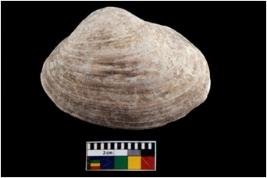 | Description / विवरण | Specimen of a large bivalve marine shell with ground edge. Probably use as spoon. |