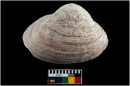 | Description / विवरण | Specimen of a large bivalve marine shell with ground edge. Probably use as spoon. |
