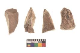 | Description / विवरण | There are n 4 utilized flakes. There are multi directional irregular scar pattern on both dorsal and ventral face of the flakes. three are tapering at one end and one has sharp edge. |