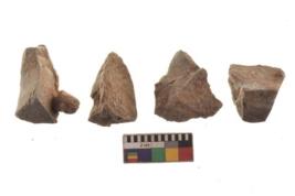 | Description / विवरण | There are n 4 utilized flakes. There are multi directional irregular scar pattern on both dorsal and ventral face of the flakes. three are tapering at one end and one has sharp edge. |