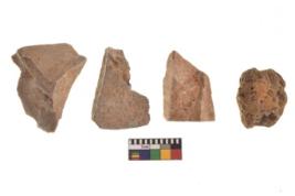 | Description / विवरण | There are n 4 utilized flakes. There are multi directional irregular scar pattern on both dorsal and ventral face of the flakes. three are tapering at one end and one has broom marks edge. |