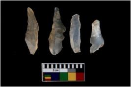 | Description / विवरण | There are n 4 utilized flake cores. There are multi directional irregular scar pattern on them. Three are tapering at one end and one has sharp edge. |