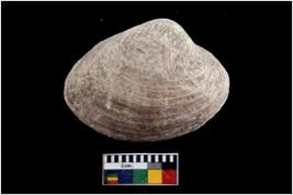 | Description / विवरण | Specimen of a large bivalve marine shell with ground edge. |