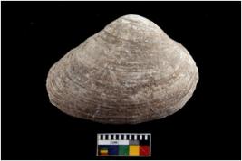 | Description / विवरण | Specimen of a large bivalve marine shell with ground edge. Probably use as spoon. |