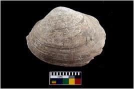 | Description / विवरण | Specimen of a large bivalve marine shell with ground edge. |