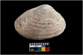| Description / विवरण | Specimen of a large bivalve marine shell with ground edge. Probably use as spoon. |