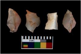 | Description / विवरण | There are n 4 utilized flake cores. There are multi directional irregular scar pattern on them. Two are tapering at one end and two have sharp edges. |