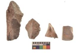 | Description / विवरण | There are n 4 utilized flakes. There are multi directional irregular scar pattern on both dorsal and ventral face of the flakes. three are tapering at one end and one has sharp edge. |