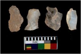 | Description / विवरण | There are n 4 utilized flake cores. There are multi directional irregular scar pattern on them. All of them are tapering at one end. |