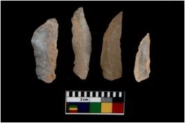 | Description / विवरण | There are n 4 utilized flake cores. There are multi directional irregular scar pattern on them. Two are tapering at one end and two have sharp edges. |