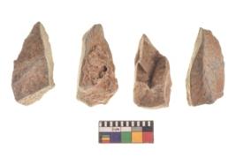 | Description / विवरण | There are n 4 utilized flakes. There are multi directional irregular scar pattern on both dorsal and ventral face of the flakes. three are tapering at one end and one has partly broken edge. |