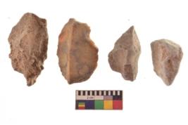 | Description / विवरण | There are n 4 utilized flakes. There are multi directional irregular scar pattern on both dorsal and ventral face of the flakes. three are tapering at one end and one has blunted edge. |