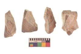 | Description / विवरण | There are n 4 utilized flakes. There are multi directional irregular scar pattern on both dorsal and ventral face of the flakes. three are tapering at one end and one has sharp edge. |