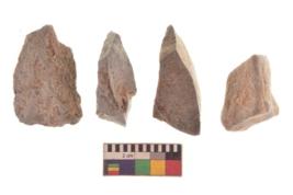 | Description / विवरण | There are n 4 utilized flakes. There are multi directional irregular scar pattern on both dorsal and ventral face of the flakes. three are tapering at one end and one has sharp edge. |