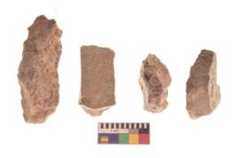 | Description / विवरण | There are n 4 utilized flakes. There are multi directional irregular scar pattern on both dorsal and ventral face of the flakes. three are tapering at one end and one has sharp edge. |