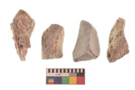 | Description / विवरण | There are n 4 utilized flakes. There are multi directional irregular scar pattern on both dorsal and ventral face of the flakes. three are tapering at one end and one has sharp edge. |