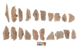 | Description / विवरण | There are n 20 utilized flakes. There are multi directional irregular scar pattern on both dorsal and ventral face of the flakes. among them they are many tapered edges, and few have broken tip |