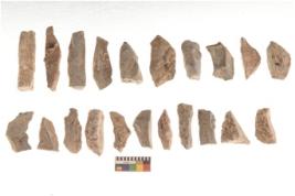 | Description / विवरण | There are n 20 utilized flakes. There are multi directional irregular scar pattern on both dorsal and ventral face of the flakes. Among them most of them have sharp edges, and few have flat base edges, |