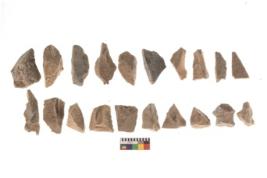 | Description / विवरण | There are n 20 utilized flakes. There are multi directional irregular scar pattern on both dorsal and ventral face of the flakes. Among them all are sharp edges, and few have flat base edges. |