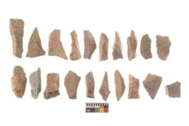 | Description / विवरण | There are n 20 utilized flakes. There are multi directional irregular scar pattern on both dorsal and ventral face of the flakes. Among them they are etapering edges, and few have broken tip.Nil |
