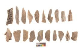 | Description / विवरण | There are n 20 utilized flakes. There are multi directional irregular scar pattern on both dorsal and ventral face of the flakes. Among them most of them have sharp edges, and few have broken tip. |