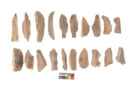 | Description / विवरण | There are n 20 utilized flakes. There are multi directional irregular scar pattern on both dorsal and ventral face of the flakes. Among them they are sharp edges, and few have broken tip. |