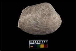 | Description / विवरण | Specimen of a large bivalve marine shell with ground edge. |