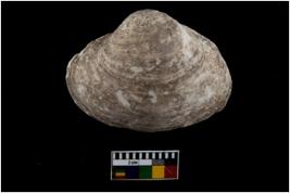 | Description / विवरण | Specimen of a large bivalve marine shell with ground edge. |