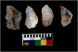 | Description / विवरण | There are n 4 utilized flake cores. There are multi directional irregular scar pattern on them. Three are tapering at one end and one has sharp edge. |