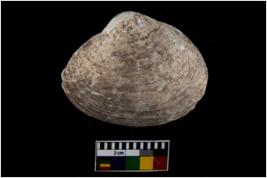 | Description / विवरण | Specimen of a large bivalve marine shell with ground edge. Probably used as spoon. |