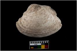 | Description / विवरण | Fragment of a bivalve marine shell with irregular shape. |