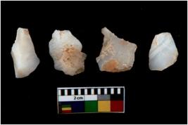 | Description / विवरण | There are n 4 utilized flake cores. There are multi directional irregular scar pattern on them. One has sharp edge and three have blunted edges. |