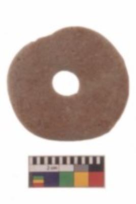 | Description / विवरण | Specimen of a perforated spindle whorl; it is damaged at the circumference. Type Red ware . |