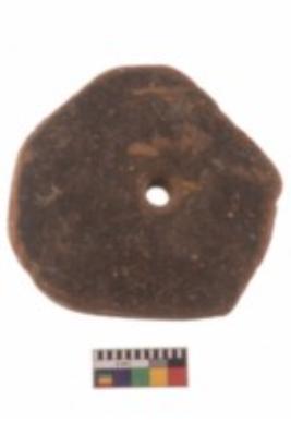 | Description / विवरण | Specimen of a perforated spindle whorl; it is damaged at the circumference. Type Red ware . |