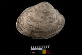 | Description / विवरण | Specimen of a large bivalve marine shell with ground edge. |