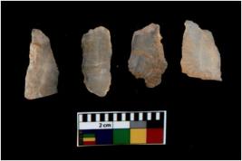 | Description / विवरण | There are n 4 utilized flake cores. There are multi directional irregular scar pattern on them. Three are tapering at one end and one has sharp edge. |