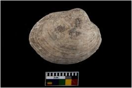 | Description / विवरण | Specimen of a large bivalve marine shell with ground edge. Probably used as spoon. |