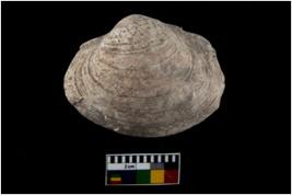 | Description / विवरण | Specimen of a large bivalve marine shell with ground edge. |