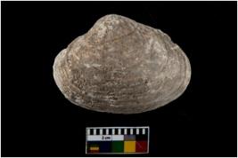 | Description / विवरण | Specimen of a large bivalve marine shell with ground edge. Probably used as spoon. |