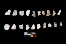 | Description / विवरण | Specimen of flakes tool with prominent flaking marks. It made up of a short flakes with sides trimmed. |