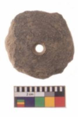 | Description / विवरण | Specimen of a perforated disc; it is damaged at the circumference, Type; Grey ware . |