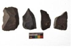 | Description / विवरण | There are n 4 utilized flakes. There are multi directional irregular scar pattern on both dorsal and ventral face of the flakes. Three have sharp edges and one has blunted edges. |