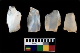 | Description / विवरण | There are n 4 utilized flake cores. There are multi directional irregular scar pattern on them. All of them are tapering at one end. |
