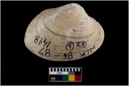 | Description / विवरण | Specimen of a large bivalve marine shell with ground edge. Probably used as spoon. |